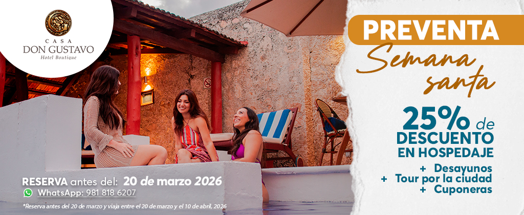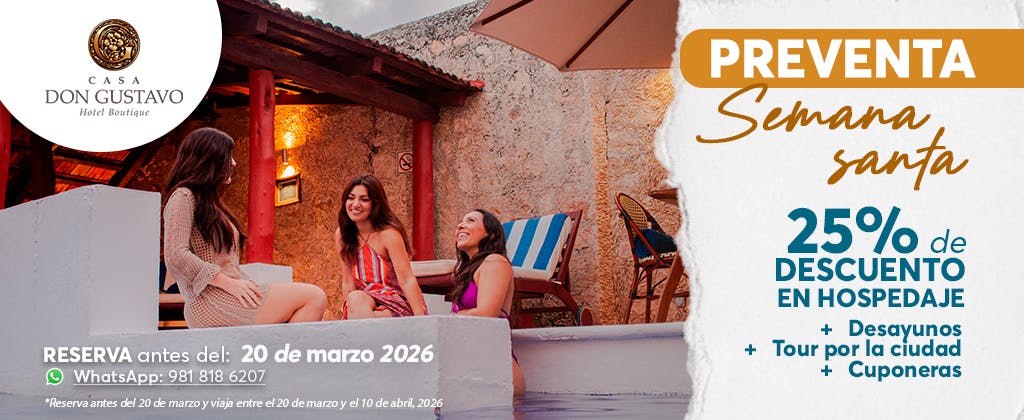 Esta Semana Santa vive la magia de Hotel Boutique Casa Don Gustavo con nuestra preventa por tiempo limitado. Disfruta de 25% de descuento en hospedaje, desayunos incluidos y un tour por la ciudad para dos personas, diseñado para que descubras la historia y el encanto de Campeche.