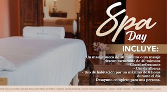 Día Spa incluye un masaje sueco de 50 minutos o un masaje descontracturante de 40 minutos, cóctel refrescante, uso de alberca, uso de habitación por un máximo de 6 horas durante el día, desayuno completo para una persona.